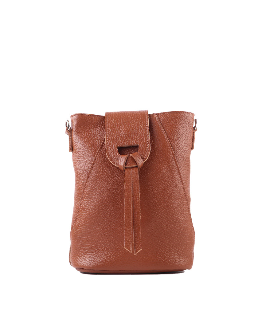 • Leather crossbody bag with a soft grain texture. The bag features a front flap with an elegant loop detail and a magnetic closure. It has a main compartment with a zipper for extra security and comes with a detachable and adjustable shoulder strap.
