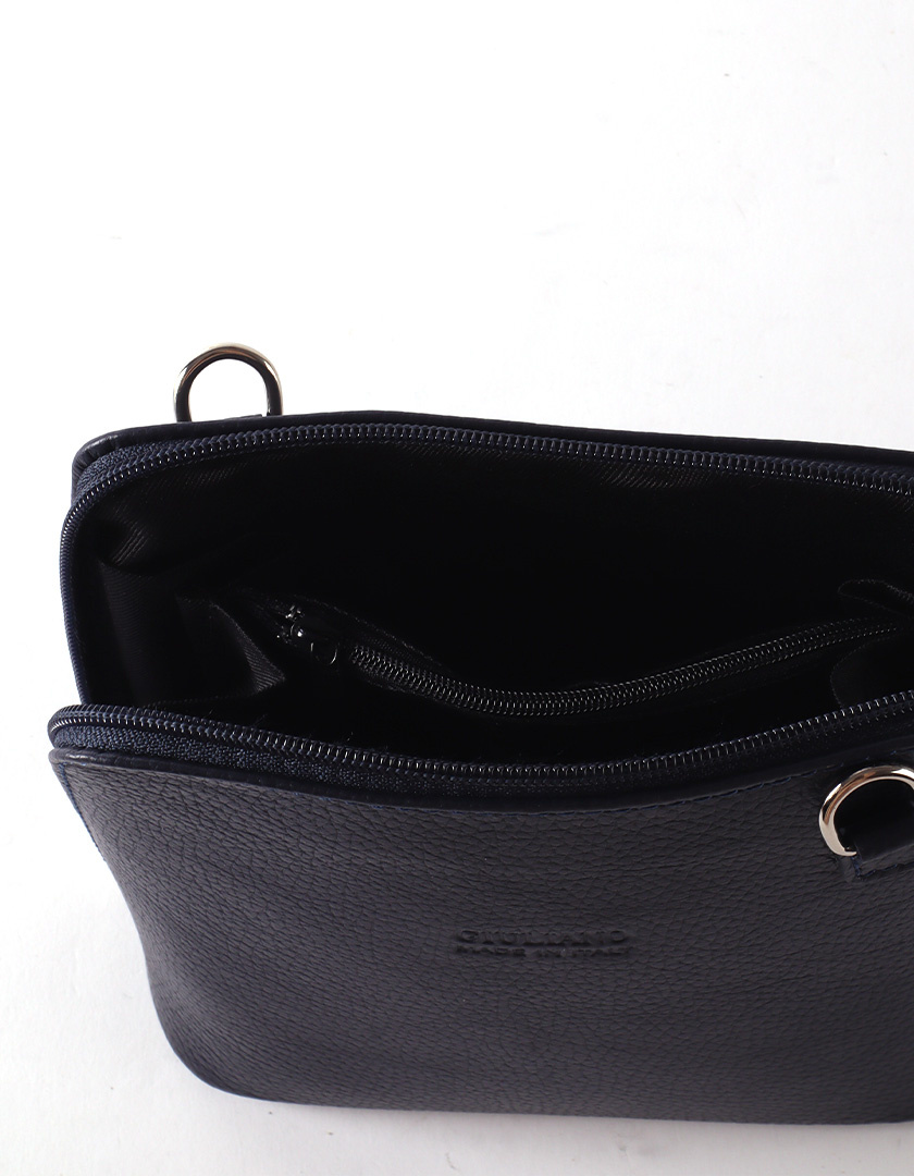 Leather shoulder bag that closes with a double zipper to the bottom. The bag has an extra pocket with zipper on one side and the shoulder strap is removable and adjustable.