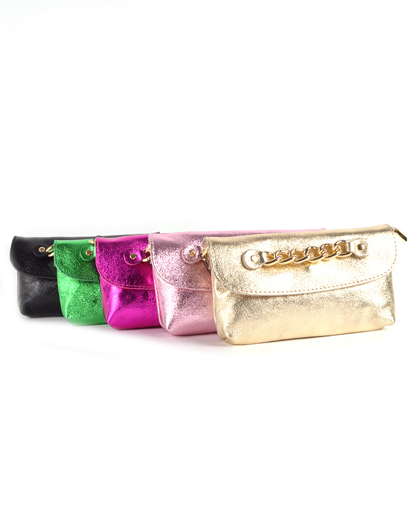 • Beautiful metallic bag. The bag has a golden chain on the front.