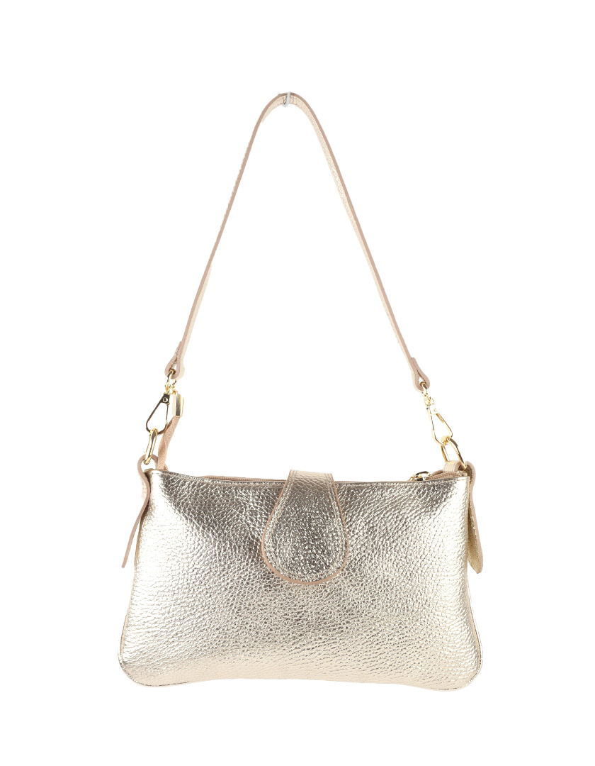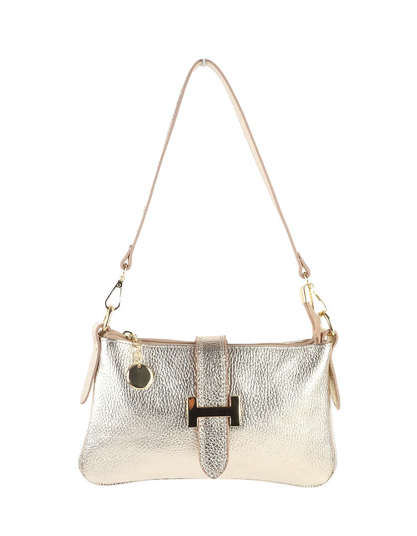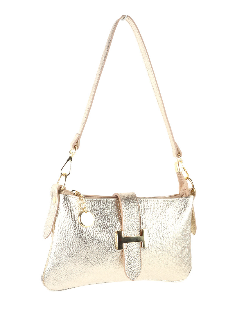 Crafted from metallic leather with a gold-tone H detail on the front. Features a zip closure with a snap-fastened leather flap. Comes with two straps: one short and one adjustable for crossbody or shoulder wear.