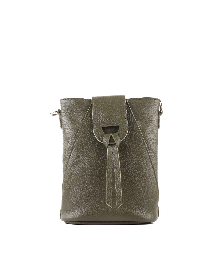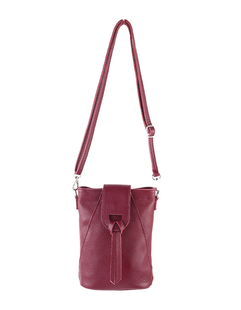Leather crossbody bag with a soft grain texture. The bag features a front flap with an elegant loop detail and a magnetic closure. It has a main compartment with a zipper for extra security and comes with a detachable and adjustable shoulder strap.