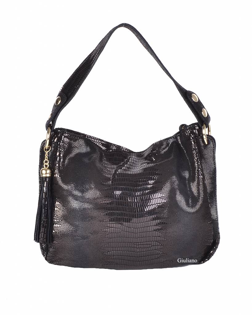 • Beautiful leather handbag with shiny coating. The bag closes with a zipper, and has an extra compartment with zipper on the inside and back. With detachable key ring on one side.