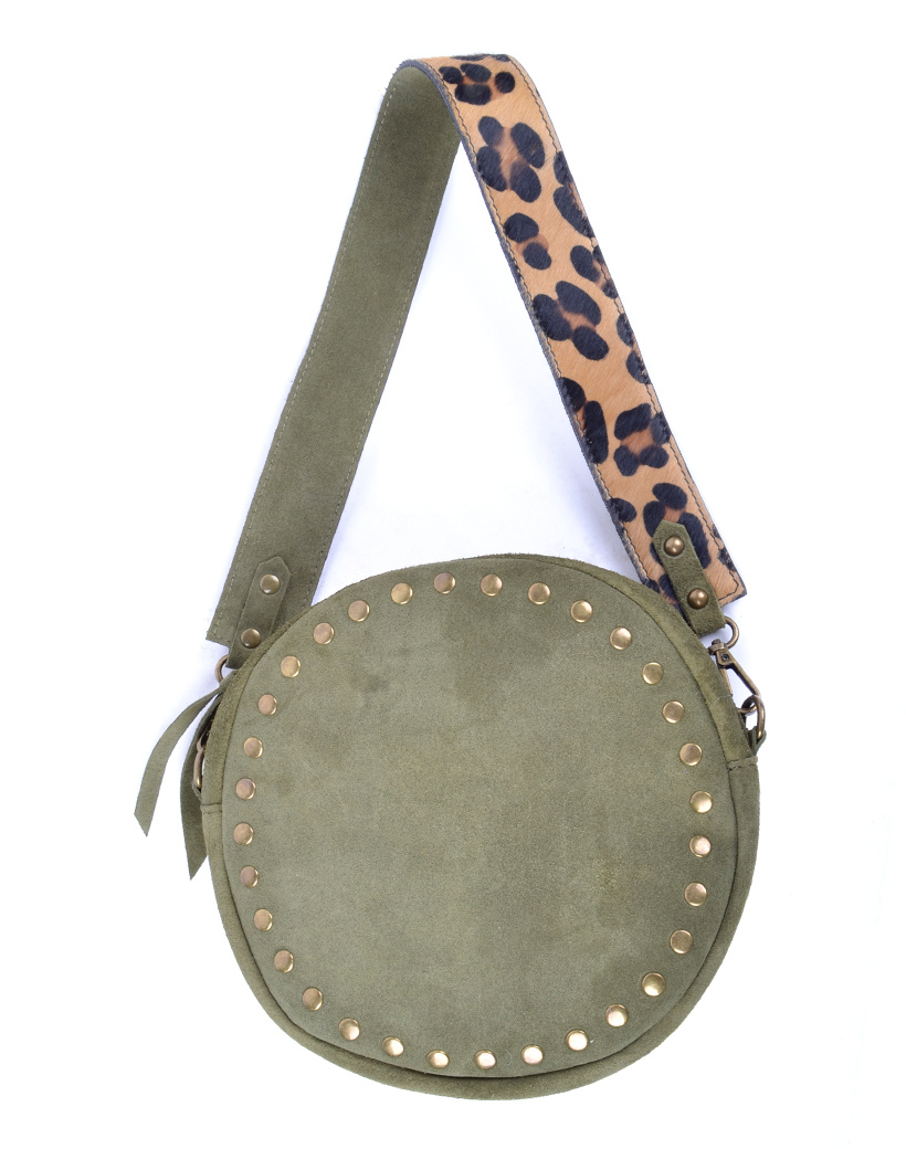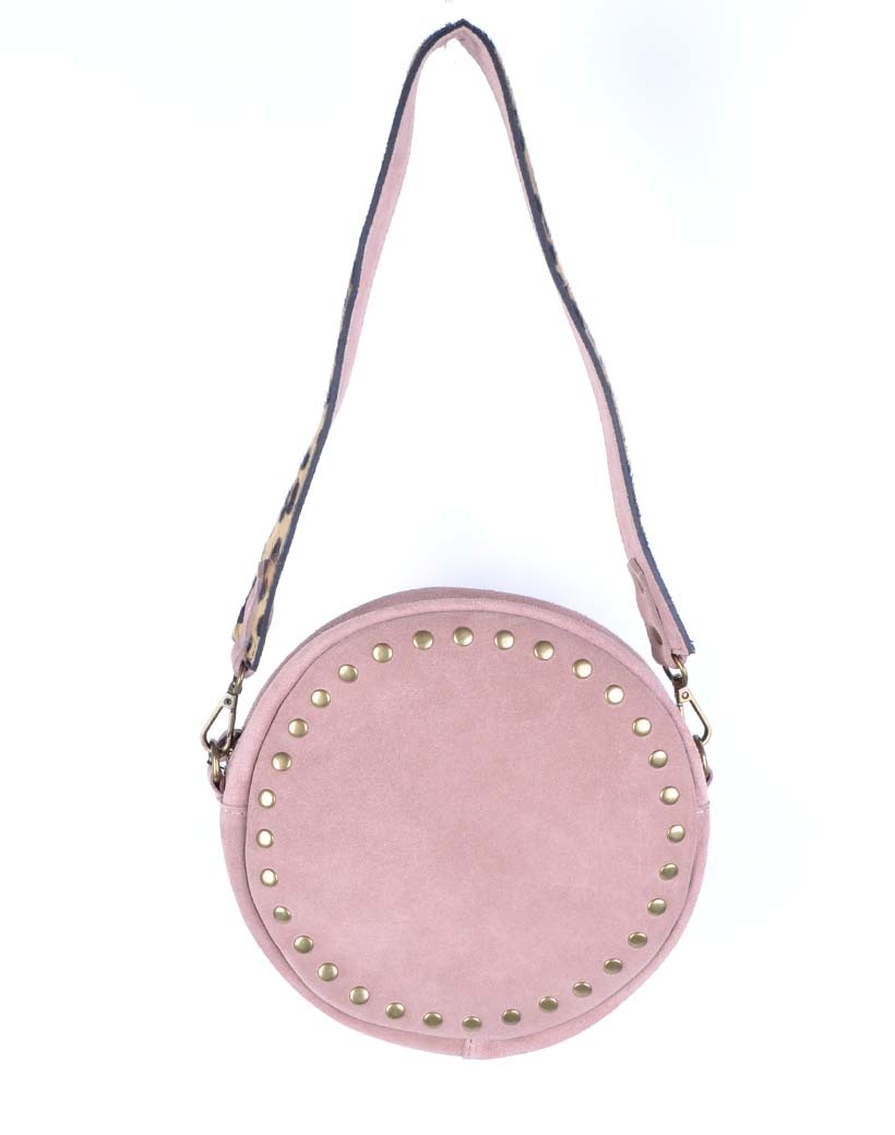 • Small suede shoulder bag with adjustable shoulder strap. The bag itself closes with a zipper, where the lid falls over.