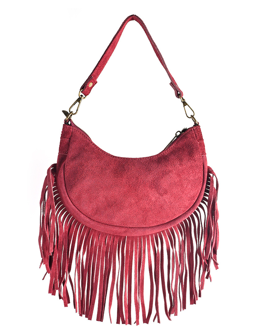 • Leather suede shoulderbag with fringes. The bag has an adjustable and removable bagstrap.