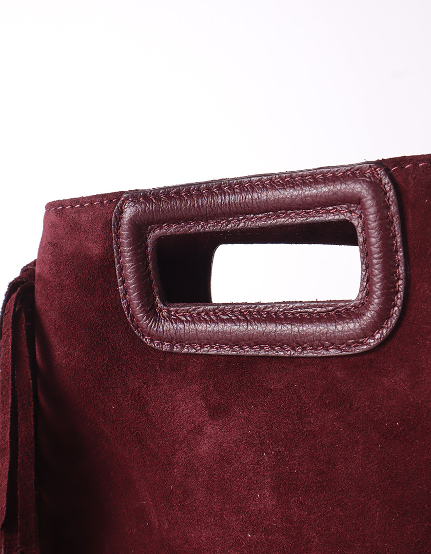 • Leather suede shoulder bag with a double row of fringes on both sides. The bag has a leather handle and closes with a zipper. The shoulder strap is removable and adjustable.