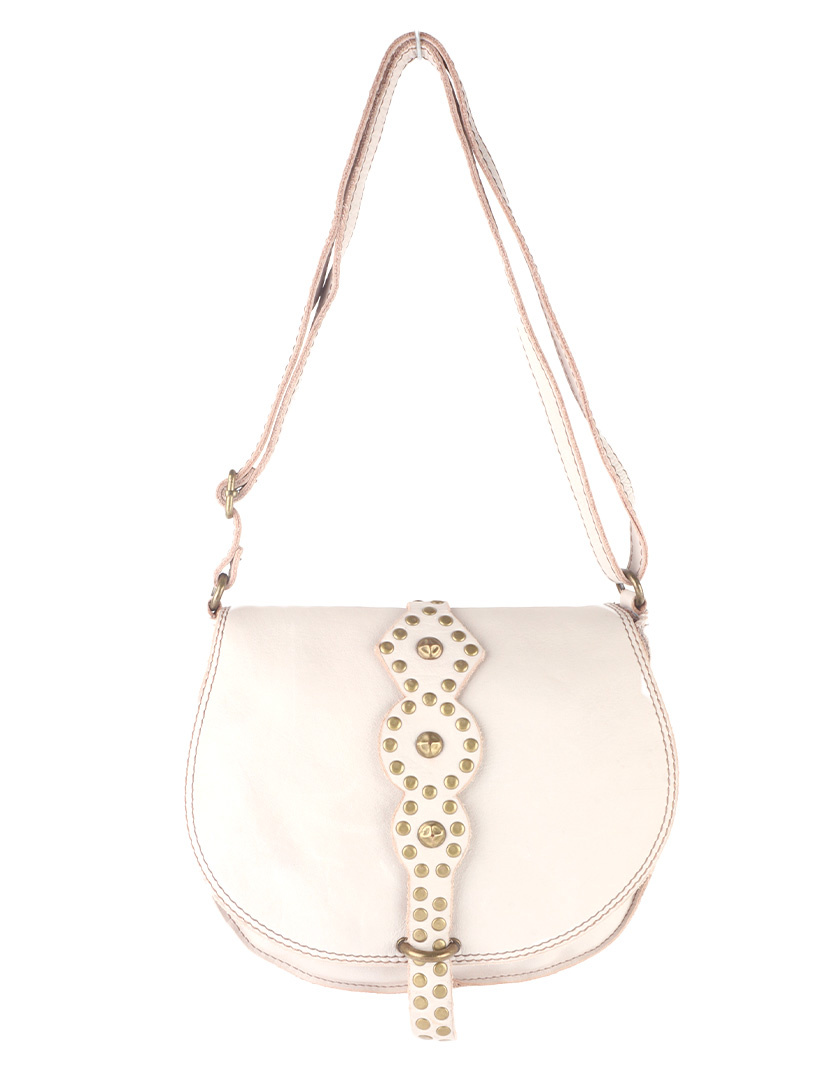 • Beautiful shoulder bag made of high-quality calf leather, finished with bronze-colored studs and an adjustable shoulder strap. The semi-circular flap closes with a leather strap and metal buckle, adding both style and functionality.