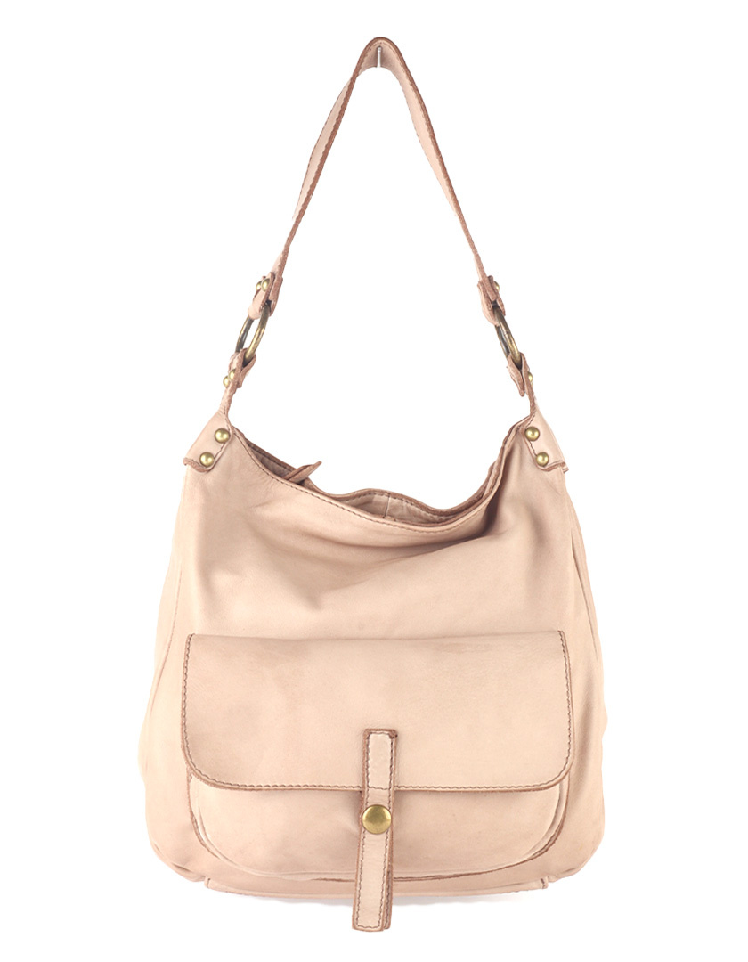 • Beautiful shoulder bag made of high-quality calf leather, finished with bronze-colored studs and an adjustable shoulder strap. The semi-circular flap closes with a leather strap and metal buckle, adding both style and functionality.